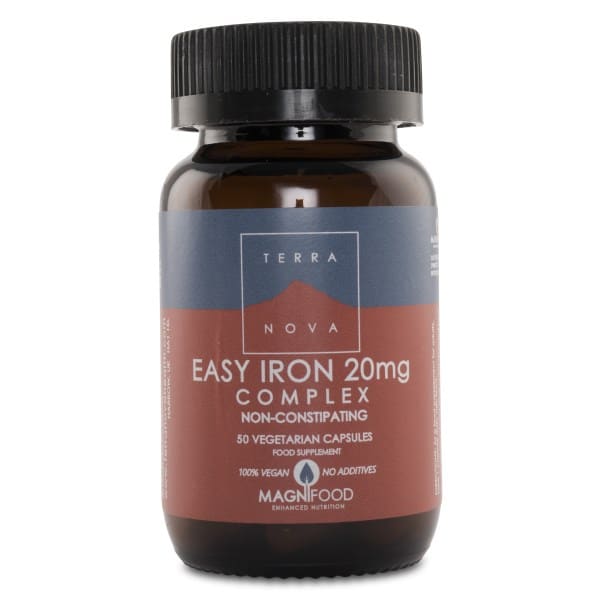 Terranova Jern (Easy Iron 20 mg Complex) er et jerntilskud i kapselform med aminosyrechelateret jern, som er mere skånsomt for maven. Terranova Jern er også forstærket med Terranovas unikke Magnifood® Complex for at sikre et bedre optag. Tilskuddet indeholder også stabiliseret risklid samt acaibær, som indeholder E-vitamin og kompenserer for den oxidative effekt, som jern har på E-vitamin, samt grønt korngræs for at hjælpe med produktionen af hæmoglobin.
